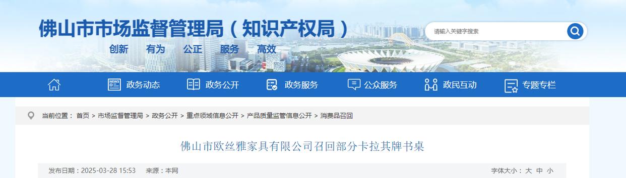 中国质量新闻网讯 据广东省佛山市市场监督管理局消息,日前,佛山市欧丝雅家具有限公司按照《消费品召回管理暂行规定》的要求,主动佛山市市场监督管理局报告了召回计划,将自即日起,召回2021年11月05日制造的部分卡拉其牌bh01型号书桌,涉及数量为15件。