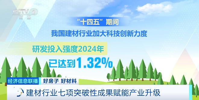 “十四五”期间,我国建材行业加大科技创新力度,研发投入强度2024年已达到1.32%,比2020年提高0.44个百分点。行业在绿色低碳、人工智能、超级材料等关键领域加速突破。