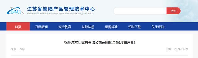 中国质量新闻网讯 据江苏省缺陷产品管理技术中心网站消息,日前,徐州沐木佳家具有限公司按照《消费品召回管理暂行规定《江苏省缺陷消费品召回管理办法》的要求,向江苏省市场监督管理局和徐州市市场监督管理局报告了召回计划,将自即日起,召回2024年1月至2024年10月期间制造的床边柜(儿童家具)规格为30*35(cm),涉及数量为8件。